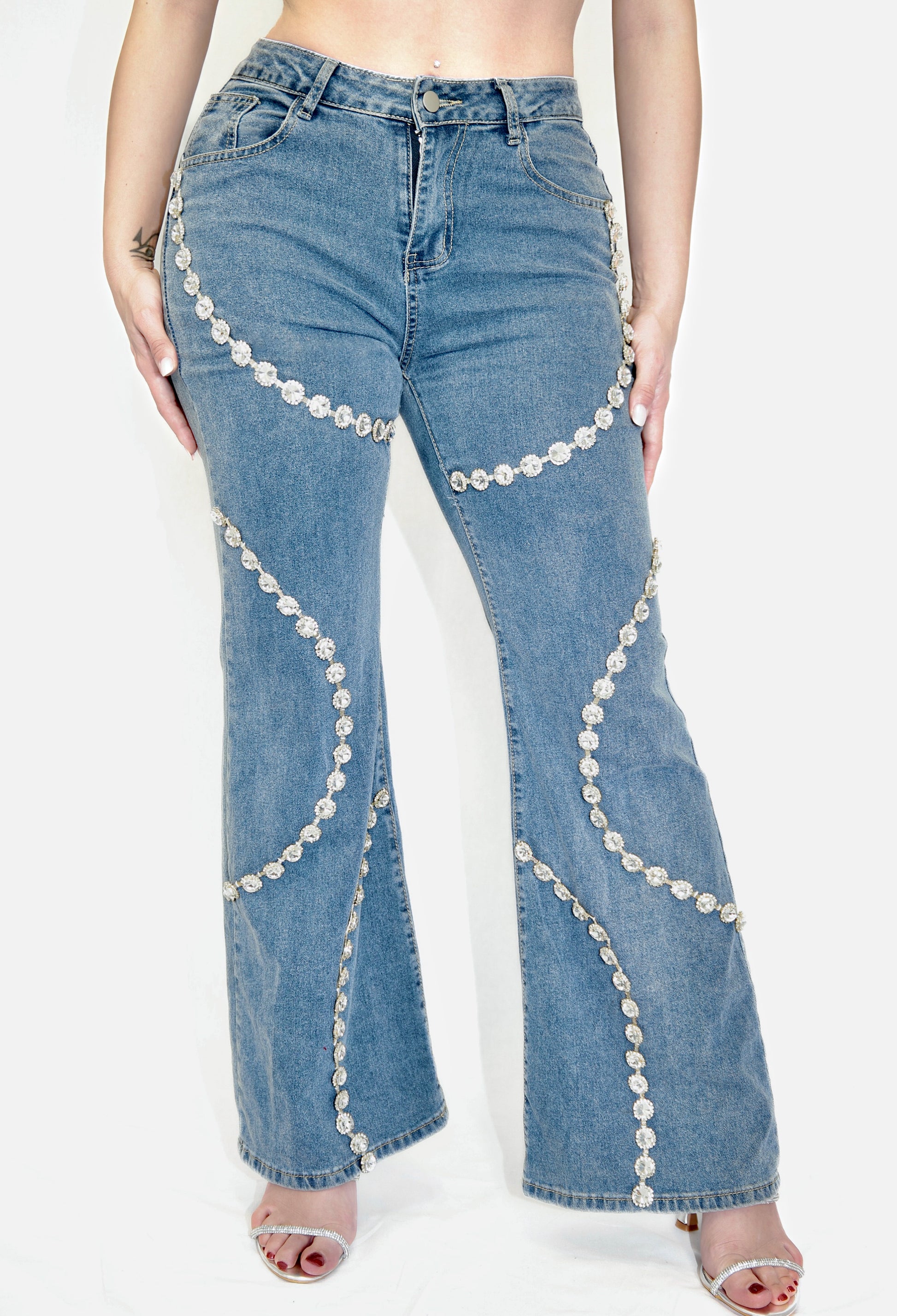 Jeans flare a vita alta in denim stretch, con applicazioni effetto diamante che valorizzano la silhouette e donano luminosità al look.